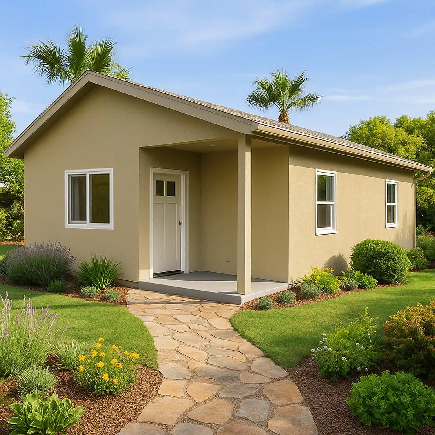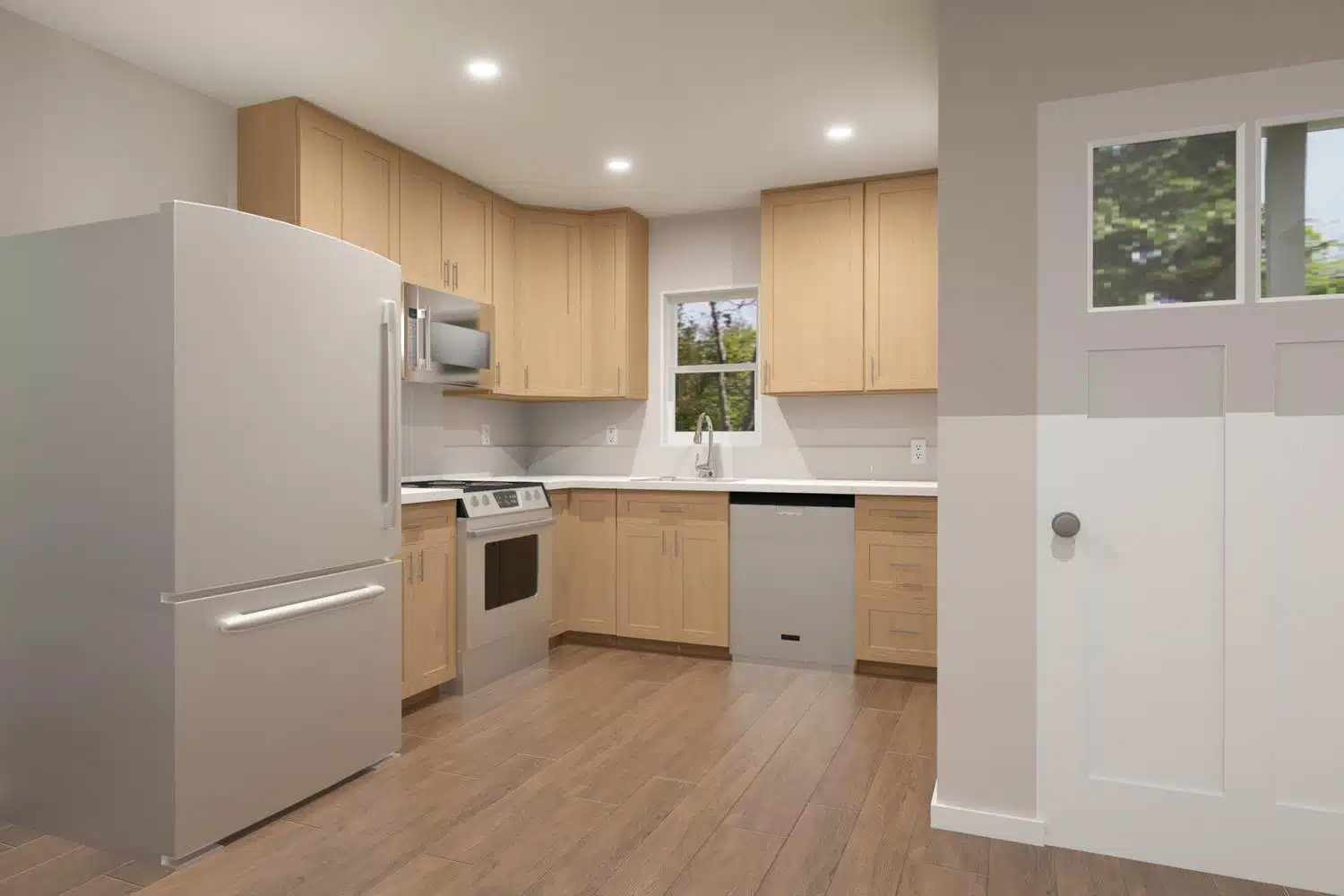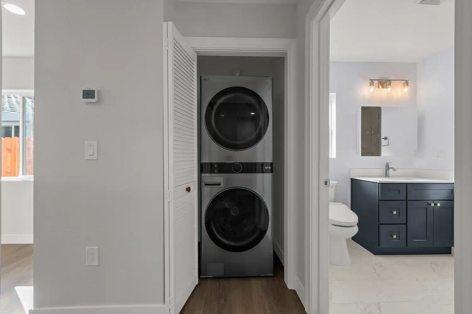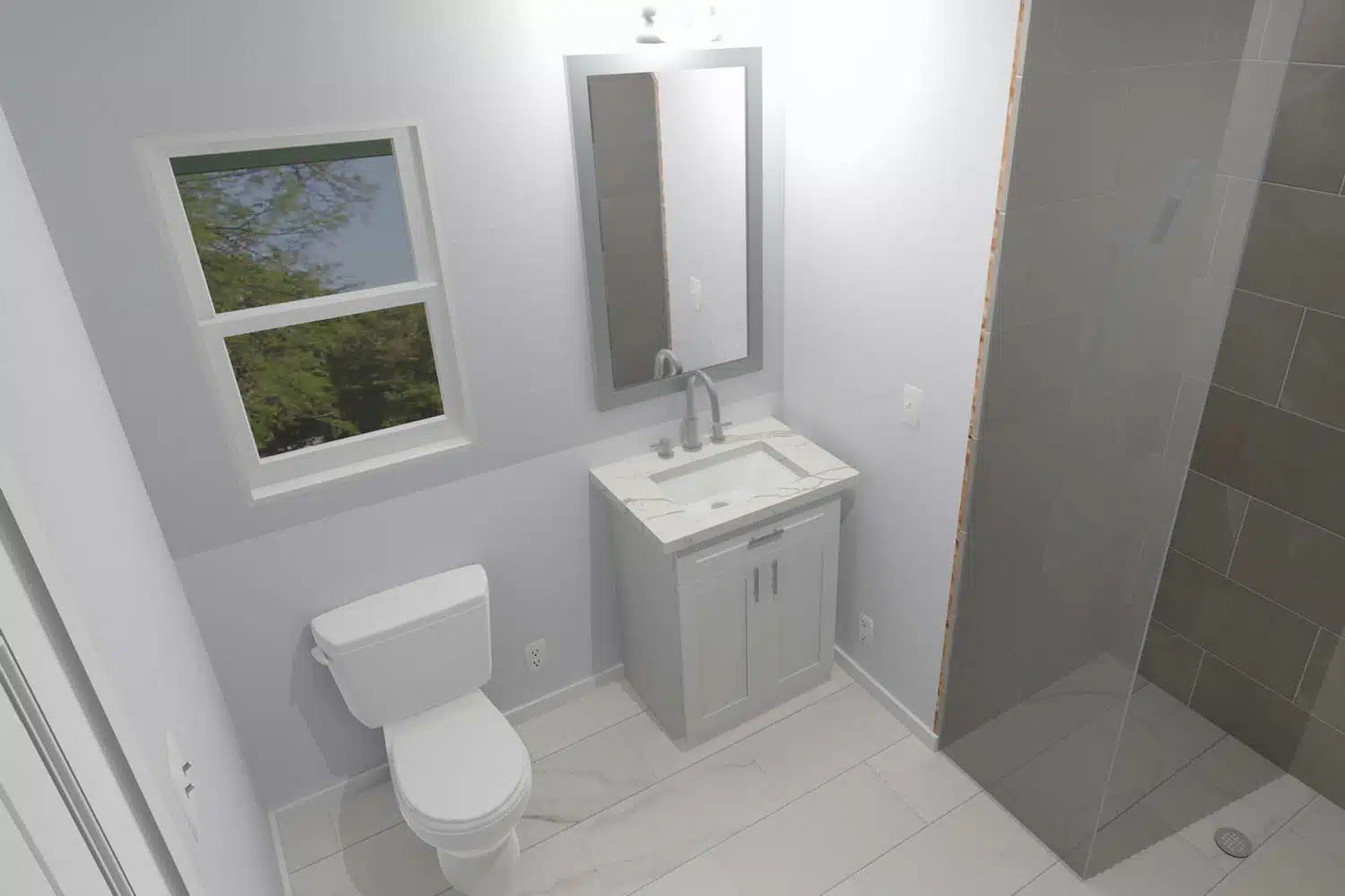 This 500 sq. ft. ADU features a bright open kitchen and living area, a private bedroom with closet, and a full bathroom designed with a curbless shower for easier accessibility. The efficient layout also includes dedicated laundry and additional storage, making the space practical for everyday living. Compact yet fully functional, this ADU works well for housing aging parents.