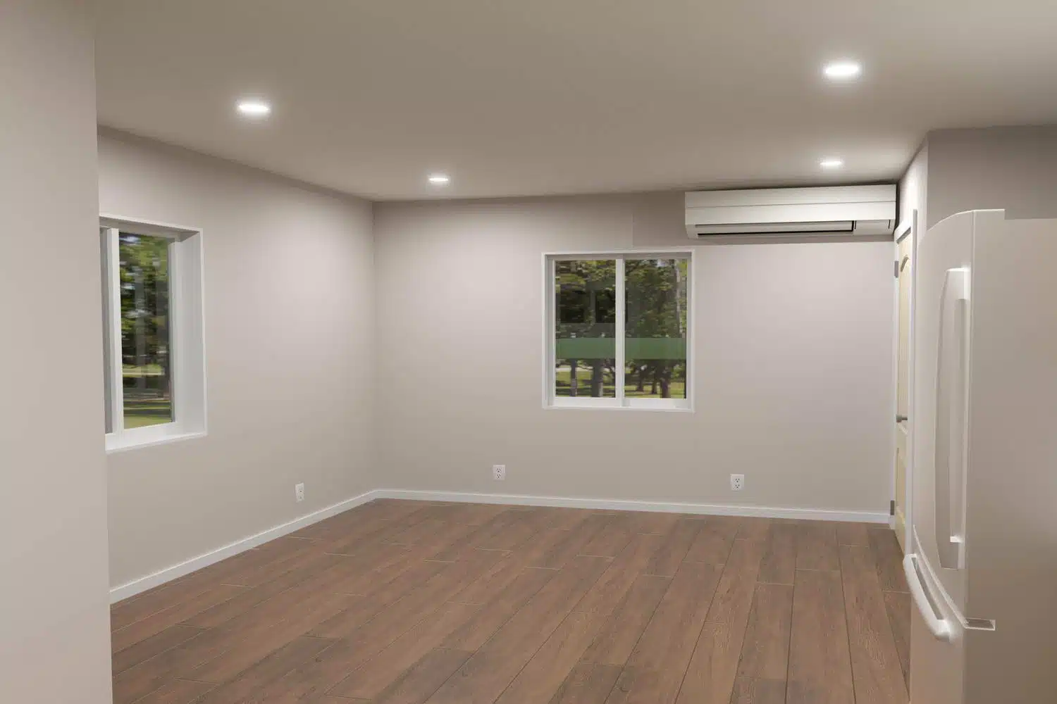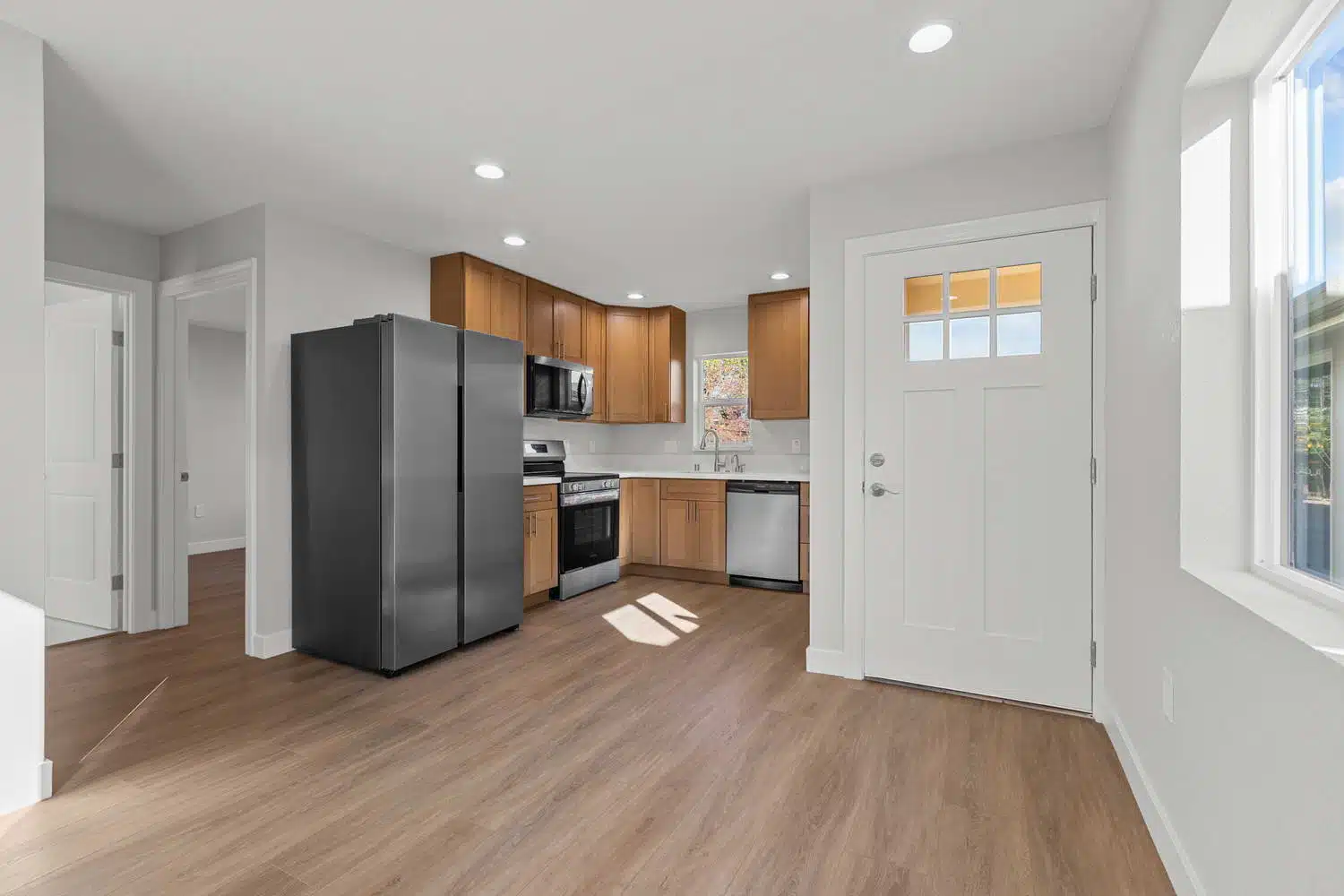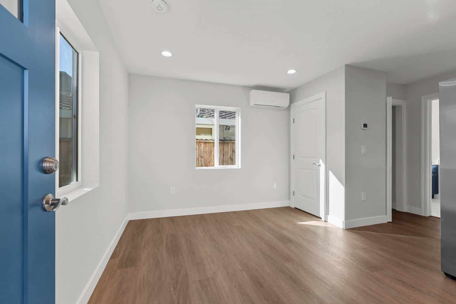 This 500 sq. ft. ADU features a bright open kitchen and living area, a private bedroom with closet, and a full bathroom designed with a curbless shower for easier accessibility. The efficient layout also includes dedicated laundry and additional storage, making the space practical for everyday living. Compact yet fully functional, this ADU works well for housing aging parents.