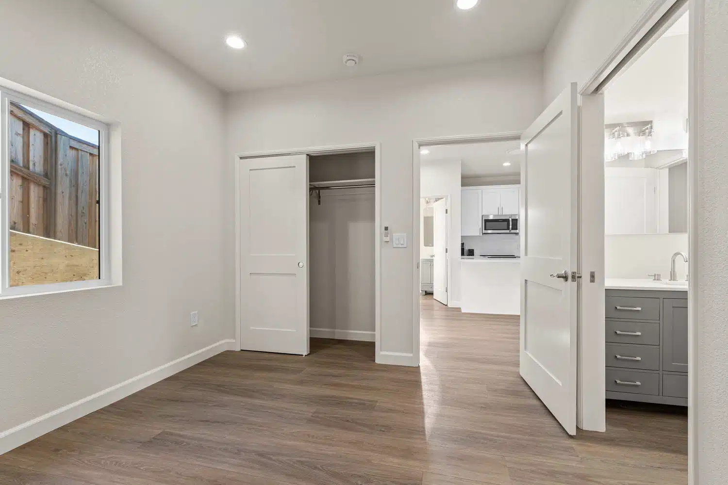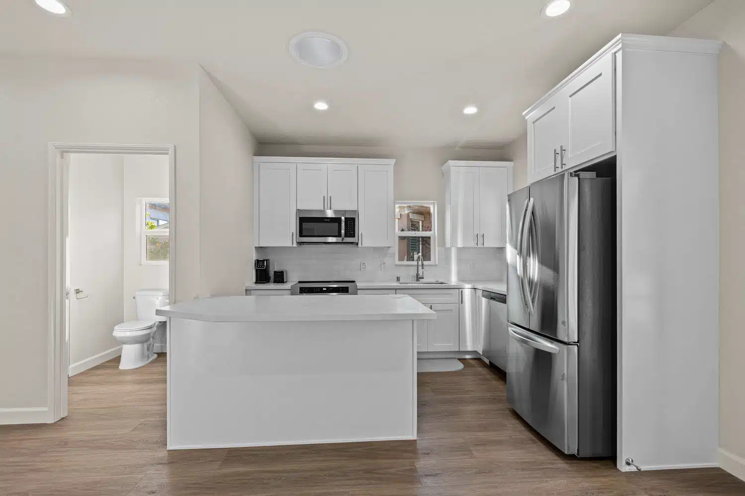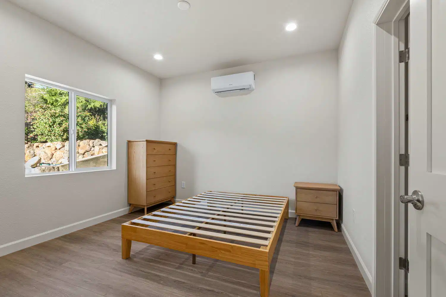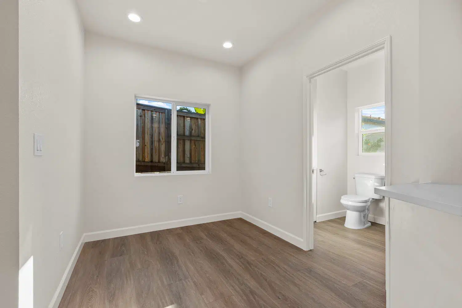 This 710 sq. ft. ADU was built as a quiet retreat separate from the main house. Designed for a homeowner who works night shifts, it features upgraded insulation for improved soundproofing and comfortable rest. The layout includes 2 spacious bedrooms with closets and shared access to a Jack-and-Jill bathroom. A large kitchen with an island, 9-foot ceilings, and a half bath with laundry complete this functional and comfortable living space.